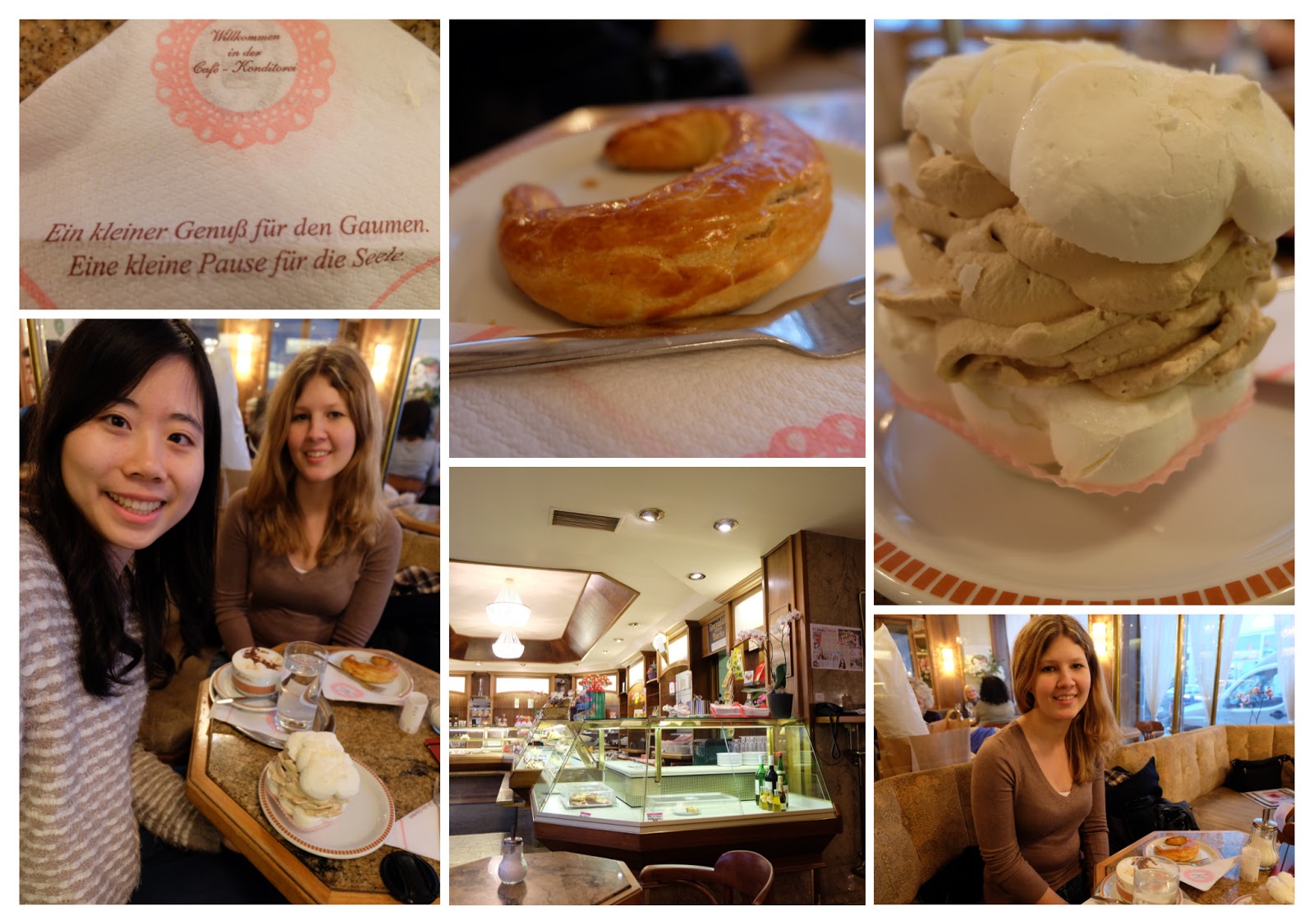 Later, we headed to Graz, the second biggest city in Austria and the capital of Styria where Alex and her sister go to university. Graz is a small city but like Lyon, I found it very comfortable and suitable for leading a life of quality. There we still went on with our journey in cafes. Alex brought me to a cafe called Kafe Konditorei which is small but warm. The croissant-like pastry in the middle of the picture is called Nusskipferl, meaning nut crescents, and the one on the right is Kaffee-Souflée. The latter’s appearance gave me an impression that it would be as soft as the creme, but I ended up being wrong. The white part was actually meringue (made from whipped egg whites and sugar – wikipedia) which was not soft and quite sweet. I’ve got wrong between meringue and creme for several times, and I always regretted when that happened…