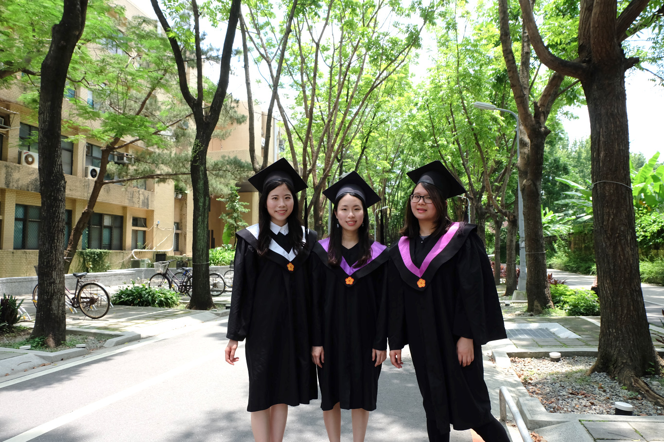 幸運的是,這一年還有學妹們跟我一起畢業,思詠和喬琪更願意跟我一起頂著大太陽在校園值得紀錄的角落駐足拍照。我們從早上九點著裝開拍,從校門口一路拍到總圖,再拍到社科院,總共花了三個半小時左右。陽光很大天氣很好,表示拍出來的照片會很美,但這也意味著我們得忍受刺眼的陽光及溽暑,尤其學士服是長袖的,上半身都悶在裡頭,沒多久就感覺我的襯衫已經被汗水浸濕了。拍到一半時,我們漸漸被陽光曬暈,有些語無倫次,但我們還是很敬業地把它拍完(這明明不是我們的工作哈)。