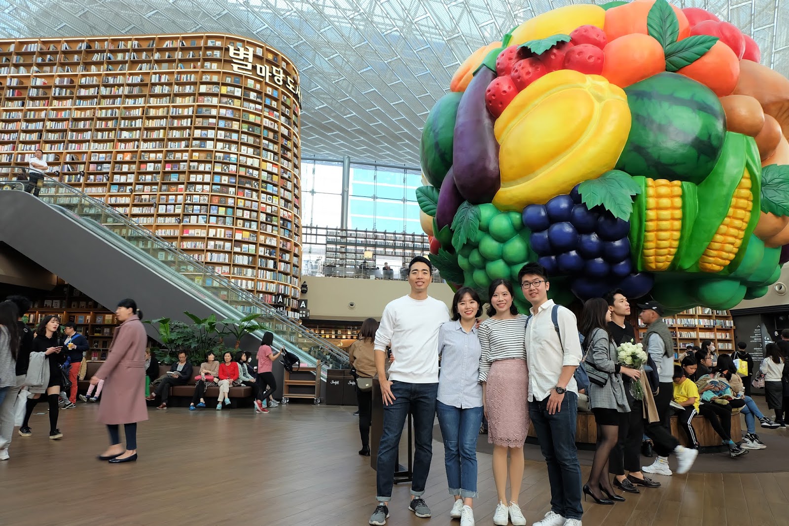 Coex Mall星空圖書館是近期非常紅的打卡景點,購物中心的一部分打造成圖書館,一整面的書櫃相當壯觀。而且這些書是可以借閱的!除了許多觀光客拍照外,現場也有不少讀者正在閱讀(不過不知道這麼吵,如何讀的下去?)。不過圖書館中間的蔬菜水果藝術品還蠻違和的可能要提醒大家多吃蔬果^_^