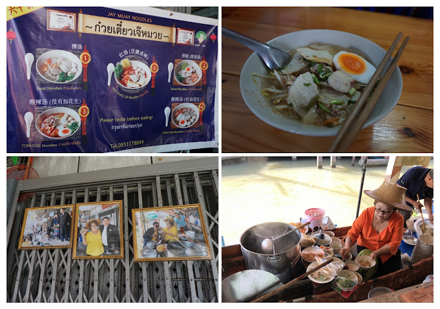 | 船麵女主人很樂意的將她的生財工具借我拍照~她就坐在船上料理,導遊說她以前真的是划著傳到水上市場中賣麵,現在老了才在她家門前的河上經營,落實「船」麵的精神,真的超酷! |