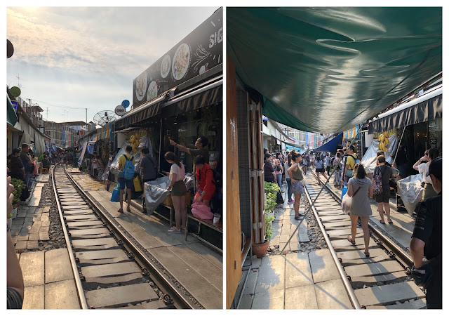 | 火車要離開囉~左:鐵軌旁的攤販立刻淨空,人群也緊貼著牆壁而站。右:火車一離開,各家攤販遮陽棚立刻撐起,又若無其事地恢復營業,這就是這個市場的「日常」吧! |