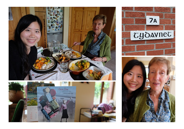 我們搭上城市郊區間的鐵路,約莫20分鐘後就抵達奶奶的家。奶奶說她回都柏林後買了一間大房子,地很大因此又在旁邊連著再蓋一間房子,不過因為她一個人,好像沒必要住這麼大間,便把原先的房子賣掉,住進新蓋的小屋。房子非常精緻可愛,是我嚮往的房子,開放式廚房面對著落地窗外的小花園,花園中擺置著桌椅,黃昏時分陽光灑進屋內,格外溫暖。牆上掛了好多幅畫,原來繪畫是奶奶最大的嗜好,雖然我不是專業評論家,但奶奶的話真的很厲害。正當奶奶忙著準備晚餐時,她向我尋求協助,原來是她最近換了智慧型手機,卻不會把聯絡人換過去,還有辦智慧型加贈的市內電話,她也搞不懂怎麼設定時間,這讓她困擾了好一陣子,看我這個年輕人一定有辦法搞定,幸好我也沒漏氣,三兩下就解決這些問題,派上了點用場。幫奶奶時,瞄到了廚房旁邊擺著一幅好有意義的明信片:一個奶奶拉著好多的行李,準備出去旅遊,標語寫著