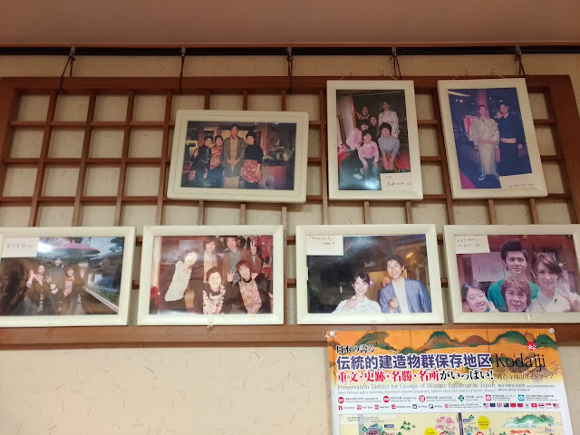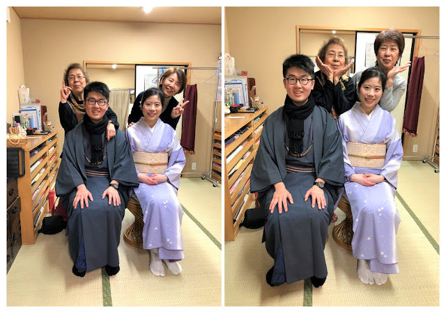 | 穿了一整天的和服、木屐,真的蠻累的😰衣服太多層,完全不敢喝水,一整天只有中途回染匠上一次廁所,除了吃小甜甜圈,也沒有進食,為了穿和服所做出的犧牲還真大呀,不過和服勒得很緊,也不太覺得餓XD 最後卸下裝備前,還跟熱情的婆婆們拍了照~因為新年,她們還準備類似戳戳樂的遊戲讓我們抽獎,Jimmy抽到大獎,是京都很有名的餅乾,超幸運! |