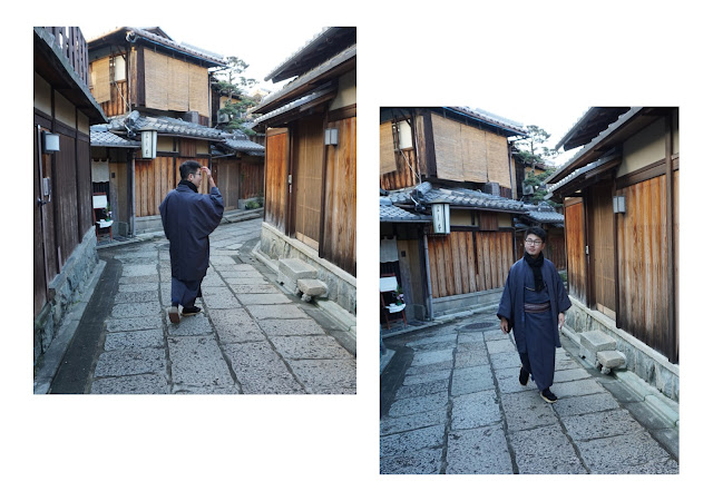 | 隨意轉進木造建築、石板小巷內,和二年坂、三年坂的熱鬧人聲相比,民宅區域瞬間寧靜許多。用連拍轉了氣質的一圈,最後一張終於破功,大笑起來。😜😛 |