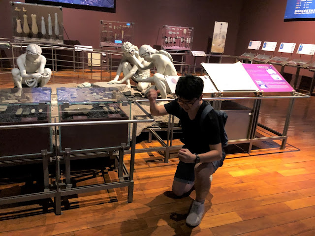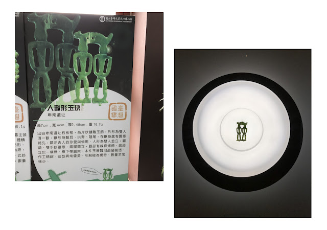 | 卑南遺址出土的「人獸形玉玦」,距今約2500年,以前只出現在歷史課本中,終於見到本尊啦! 根據網路資料,卑南遺址截至目前為止,總共出現三件完整的「雙人頂獸」造型的玉耳飾,除了這件,還有一件在台大人類學系、另一件為個人私藏。人獸形玉玦是由墨綠色的半透明臺灣玉磨製而成,並具有兩項重要特徵,一是因為在史前時代已斷成兩半,所以器身上有兩個修補孔。另一個是器物的造型在「雙人」底下各有一個小小突起。(來源) |