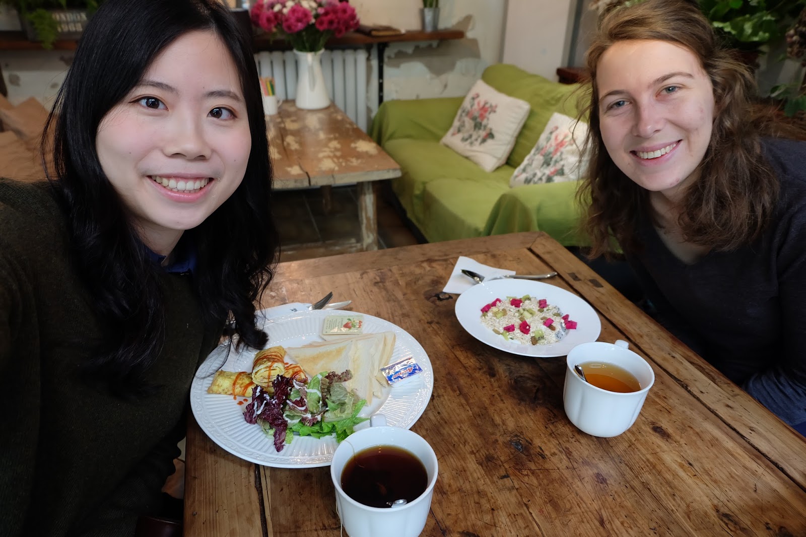 這次的北京行,旅遊觀光算是次要的,最重要的是見見好/老朋友Anna, Maddy, Amy。Anna是加拿大人、Maddy則是澳洲人,她們兩個都是我大一時候認識的,當時分別在台大及政大學中文。不過我們彼此的認識方式並不是一般的語言交換或是認識外國人的社團,而是神奇的巧合,緣份吧! Anna就像是我的姐姐一樣,大一時一起去了好多活動和地方,我的英文口說能大幅進步也得歸功於她! 和Maddy雖然真正見面的次數不算多,但我們仍然保持著聯繫,大三上時她來台灣參加研討會時也有再見面。Amy是我的學姊,在里昂交換期間,她算是我唯一最熟的台灣人,不僅是我的鄰居、mentor、也是專業攝影師和美食尋訪者,跟著她總是可以學到很多、吃到美饌(我在里昂吃過的餐廳應該不及她的十分之一XD)