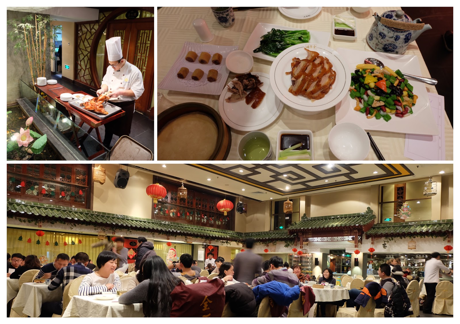 逛到什剎海時,正嚷嚷著來北京一定要吃一次烤鴨,就剛好遇到了全聚德,等了約莫15分鐘就有位置(這裡不若王府井或市中心熱鬧,不然肯定得等更久)。北京的第一餐很豐盛,我們點了半隻烤鴨、兩樣菜、驢打滾、一壺茶。我最喜歡的是甜點驢打滾,這是以糯米做皮,紅豆做餡的滿族傳統小吃,清朝時也被列為宮廷甜點。吃了一會兒,旁邊的舞台上開始熱鬧了起來,彈古箏的、川劇變臉、耍雜技(但他一直失敗…)等節目一個接著一個,不知道是不是每天晚上都有這些表演,來吃飯剛好遇到,好幸運啊。有位西方小弟弟從頭到尾拿著相機站在舞台旁邊拍,想必對他來說是個非常新鮮的收穫!