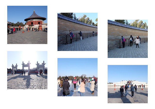 | 左上角是天壇的布局圖,北圓南方的壇牆和圓形建築搭配方形外牆的設計,都寓意著傳統的「天圓地方」的宇宙觀。 天壇也是個公園,許多人會在早晨前來運動,長廊上還有許多老人聚在一起下棋。 |