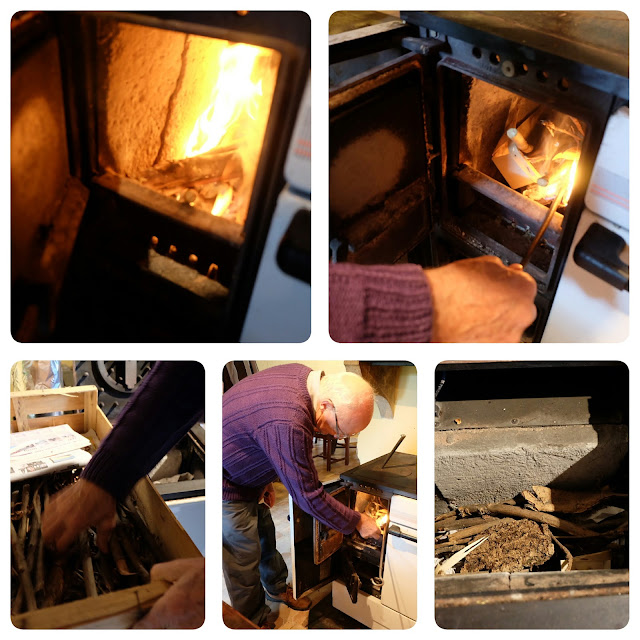 Pierre a mis le feu par brûler du bois et des papiers dans la fournaise à bois,